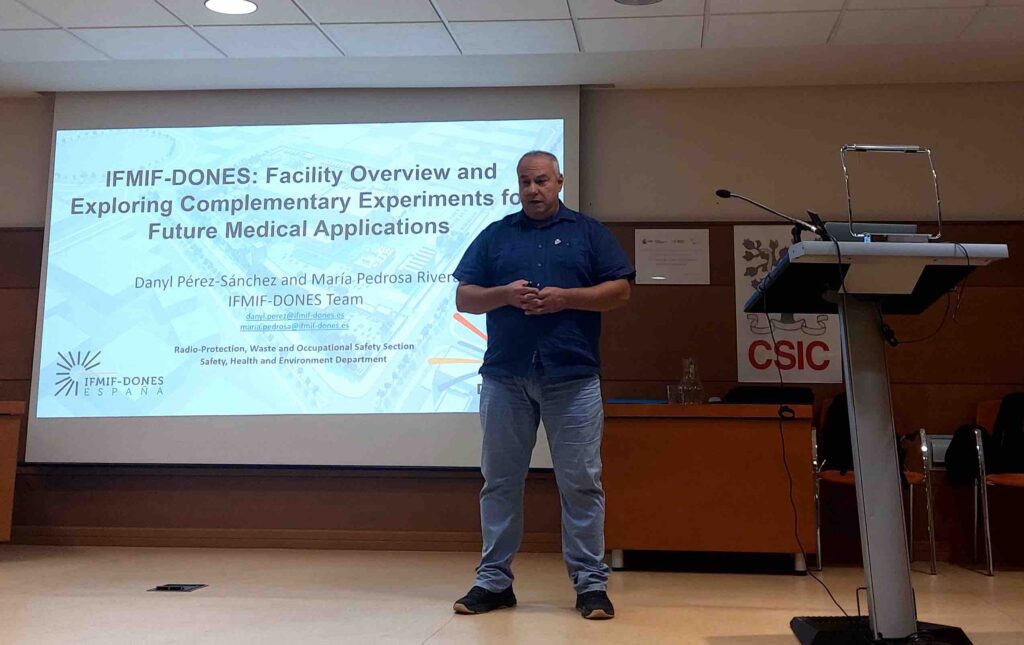 María Pedrosa Rivera, Safety and Radiation Protection Analyst at IFMIF-DONES, and Danyl Pérez Sánchez, Head of the Radiation Protection, Waste and Occupational Safety Section within the Safety, Health and Environment Department at IFMIF-DONES delivered the presentations. Both speakers presented the current status of the particle accelerator facilities, their main objectives, and the potential for complementary experiments with promising applications in the medical field.