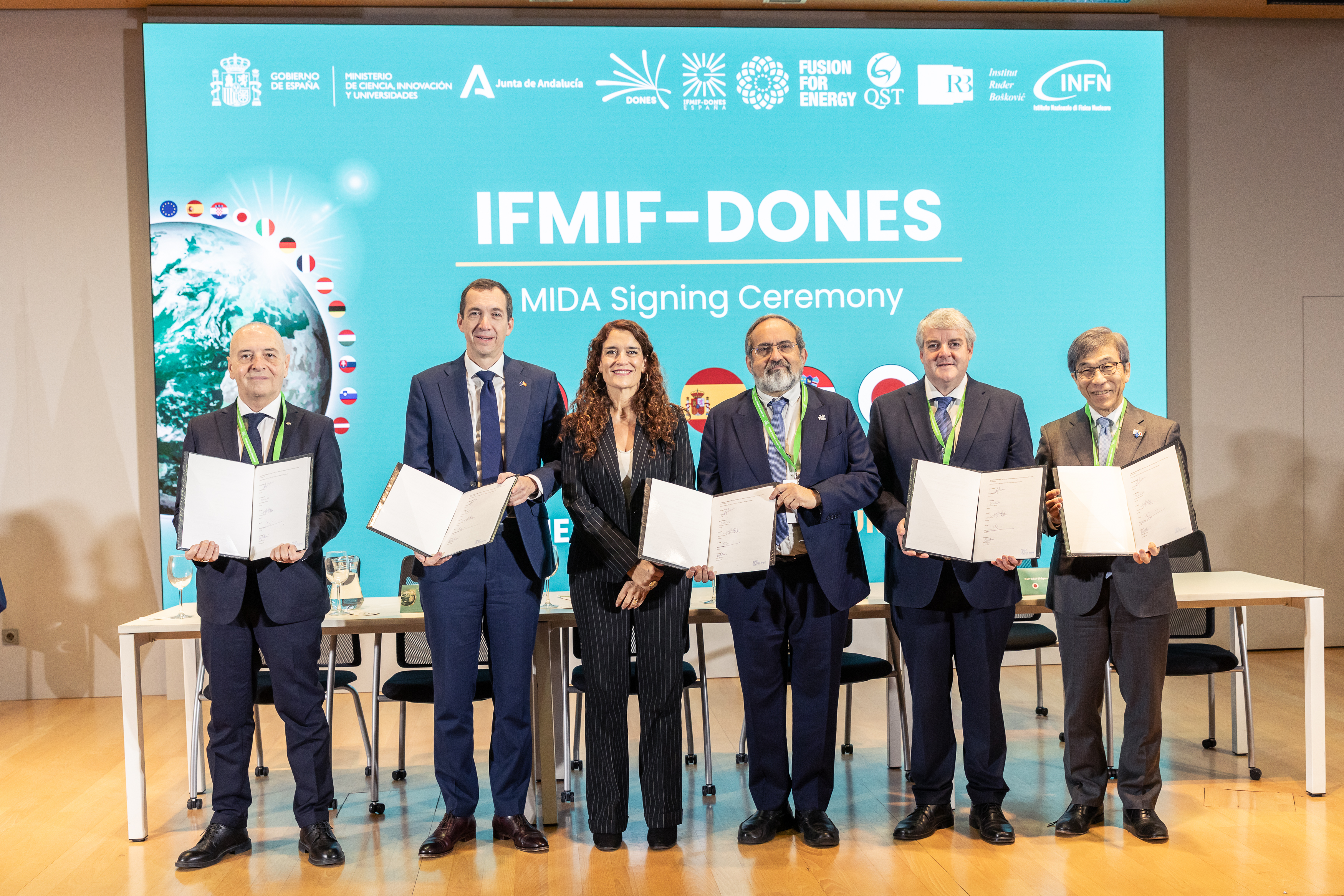 The IFMIF-DONES España Consortium -composed of the Ministry of Science, Innovation and Universities of the Government of Spain and the Regional Ministry of University, Research and Innovation of the Government of Andalusia- has today signed, together with representatives from Fusion for Energy (F4E) and R&D&I centres from Croatia (RBI), Japan (QST) and Italy (INFN), the International DONES Multilateral Agreement (MIDA). This agreement will strengthen international collaboration to develop fusion energy through the particle accelerator in Escúzar (Granada), considered a clean, safe, sustainable and virtually unlimited energy source, similar to the one produced at the core of the Sun and stars.