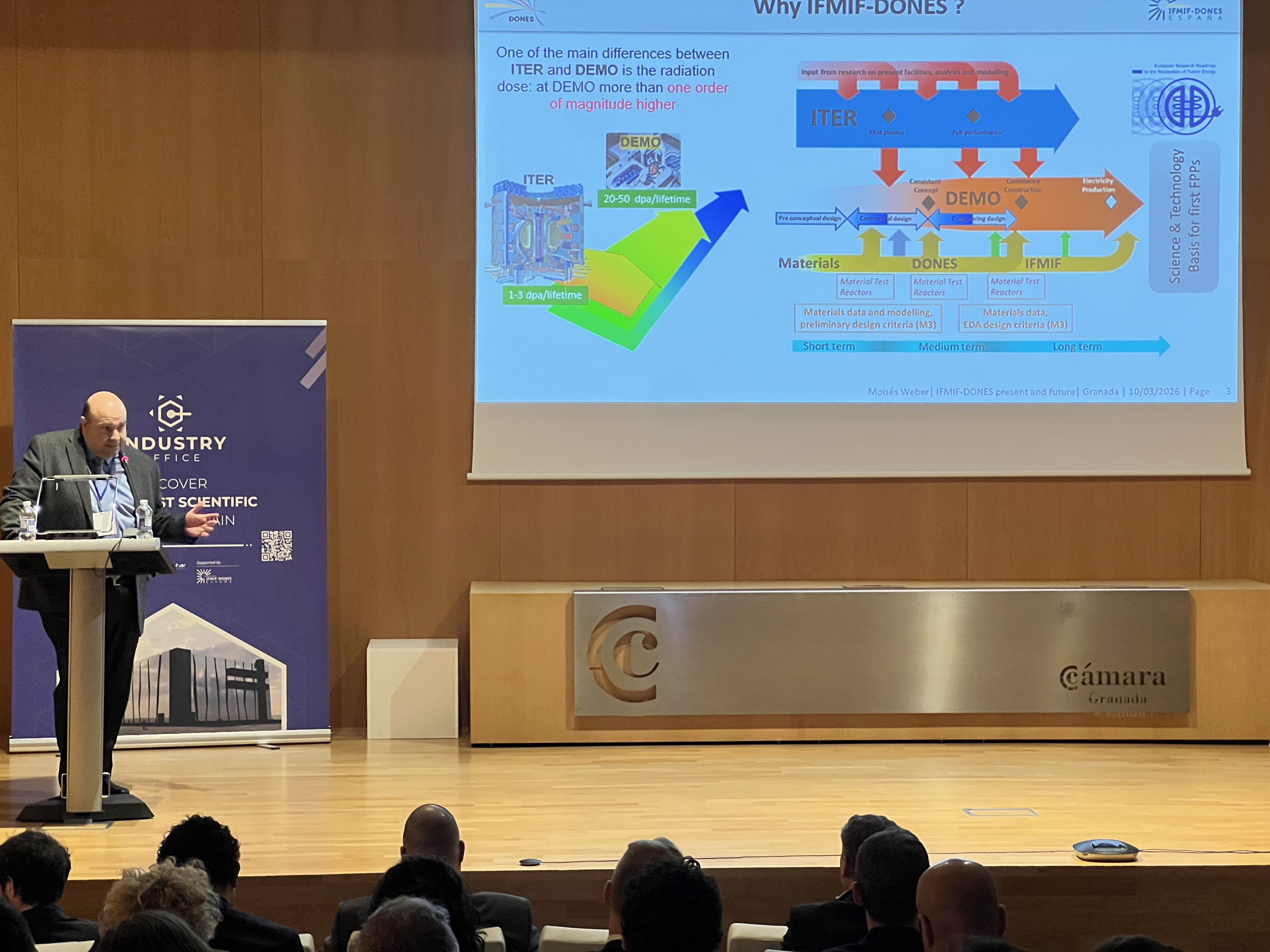 Durante la jornada intervinieron Moisés Weber, director interino de IFMIF-DONES; Philippe Cara, DONES programme manager; y Erik Fernández, director general de Ineustar, entre otros. Tras las ponencias tuvo lugar una mesa redonda sobre el estado actual y futuro del ecosistema de fusión en Europa.