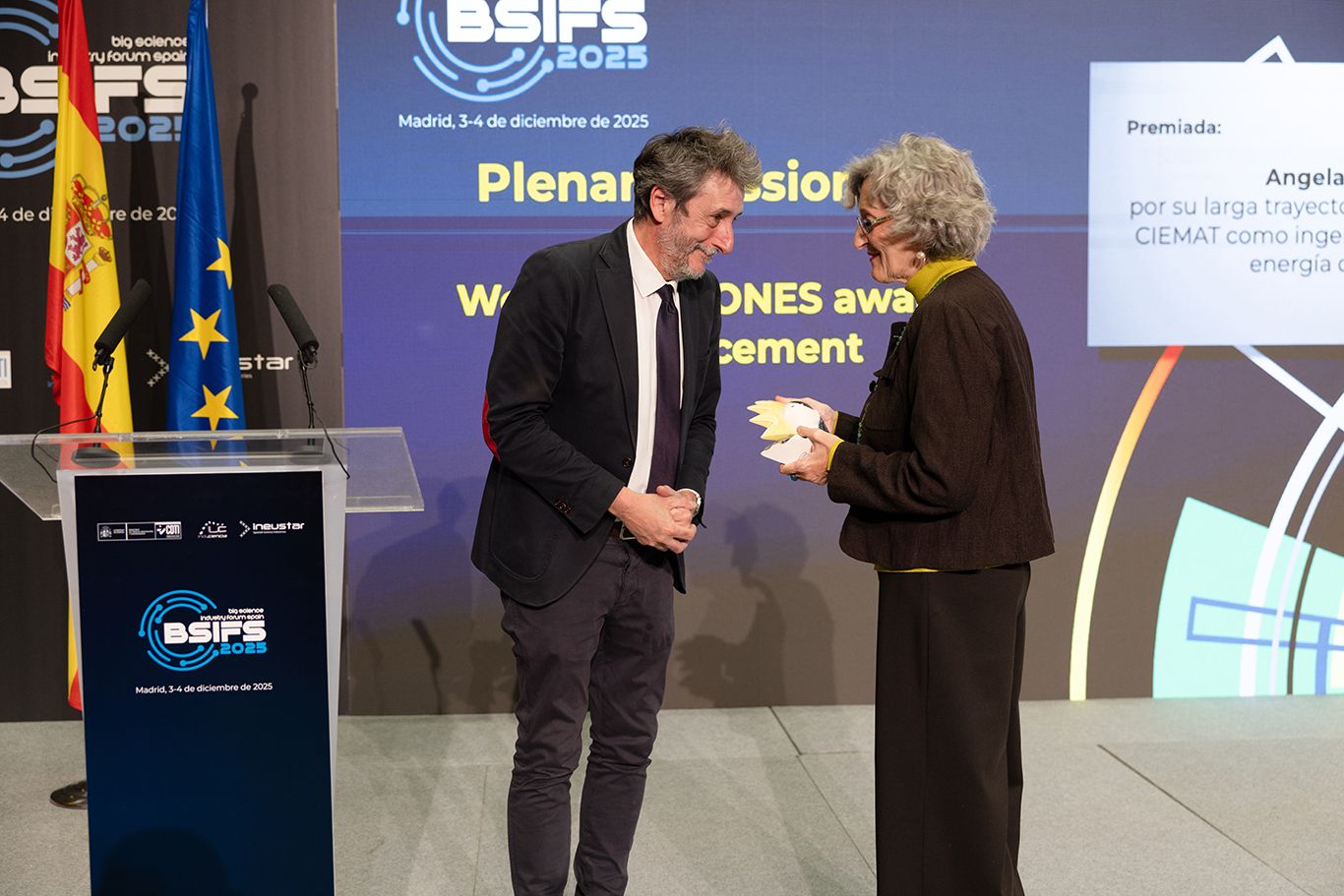 La ceremonia de clausura del Big Science Industry Forum Spain (BSIFS) sirvió de escenario para el reconocimiento otorgado a Ángela García por el colectivo Women in Dones (WiD) con motivo de su contribución al desarrollo de la energía de fusión. Durante su exitosa trayectoria, Ángela García ha trabajado en organizaciones como CIEMAT, ITER e IFMIF-DONES, entre otras.