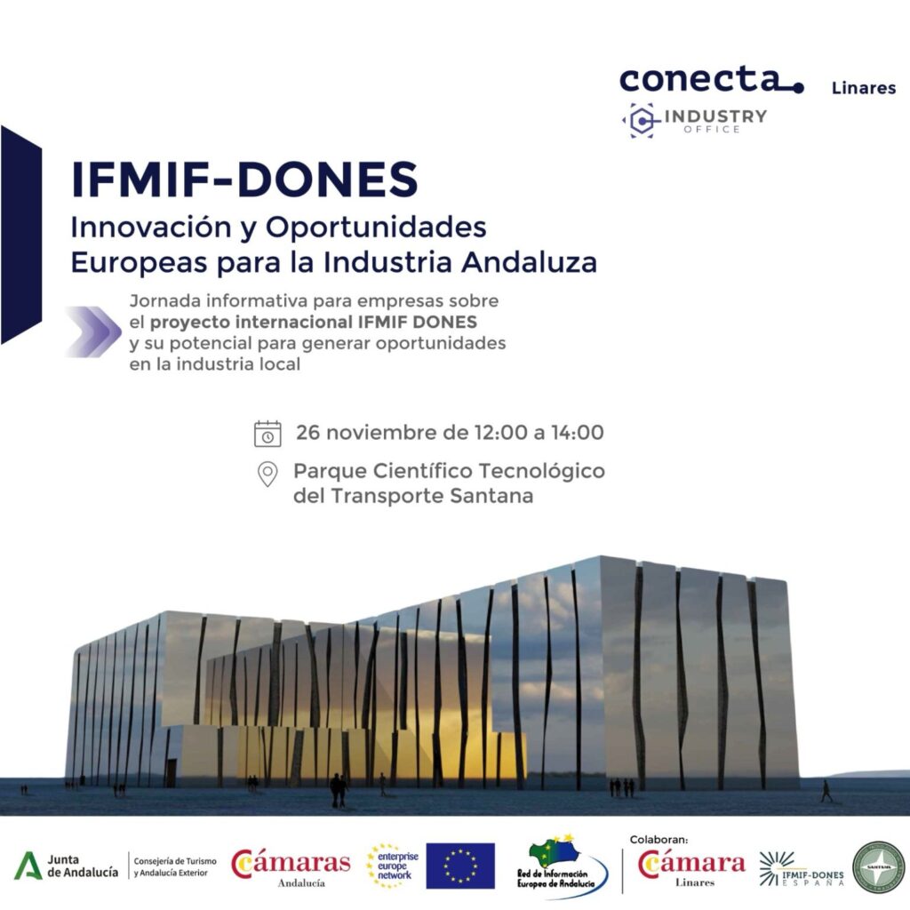El Consejo Andaluz de Cámaras de Comercio, junto con IFMIF-DONES y la Cámara de Comercio de Linares, en colaboración con la Red de Información Europea de Andalucía, organiza, bajo las jornadas “Conecta Industry Office”, impulsada por la Industry Office, la jornada “IFMIF-DONES: Innovación y Oportunidades Europeas para la Industria Andaluza”, que se celebrará el 26 de noviembre en el Parque Científico Tecnológico del Transporte Santana (Linares).